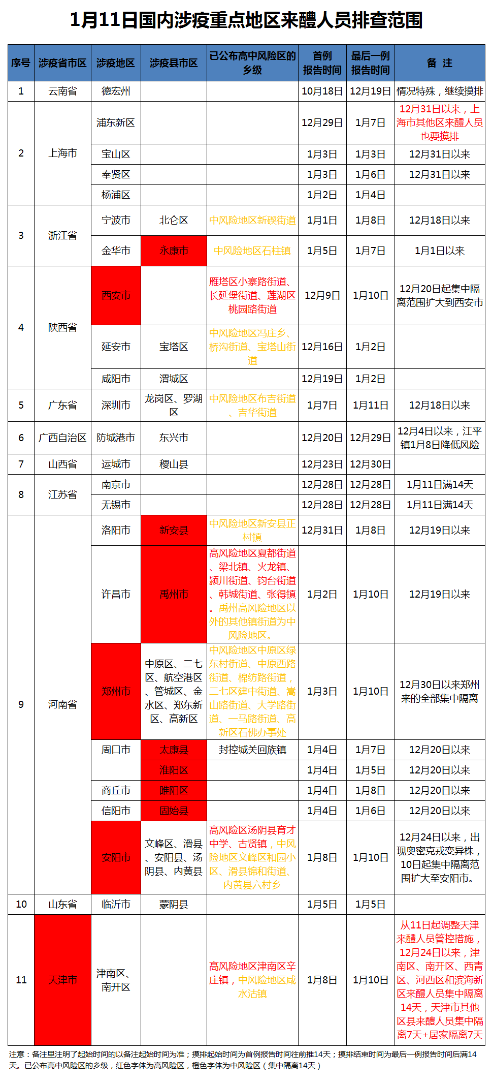 当前,国内零星散发病例、本土病例和聚集性疫情仍然时有发生。为严格落实“外防输入、内防反弹”防控策略,控制和降低新冠肺炎疫情传播风险,确保全市人民生命安全和身体健康,醴陵市委新冠肺炎疫情防控工作指挥部公布《1月11日国内涉疫重点地区来醴人员排查范围》。