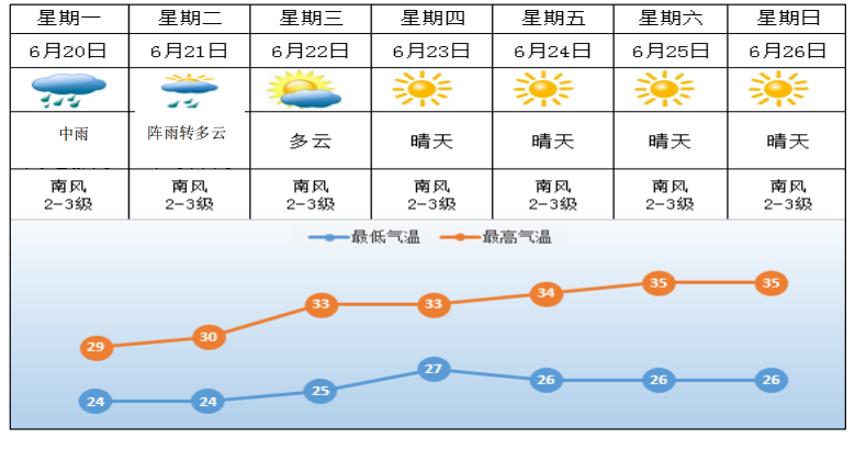 本周(6月20~26日)我市前雨后晴,气温逐渐回升,最高气温可达35℃。20日中雨;21日阵雨转多云;22~26日以晴到多云天气为主。